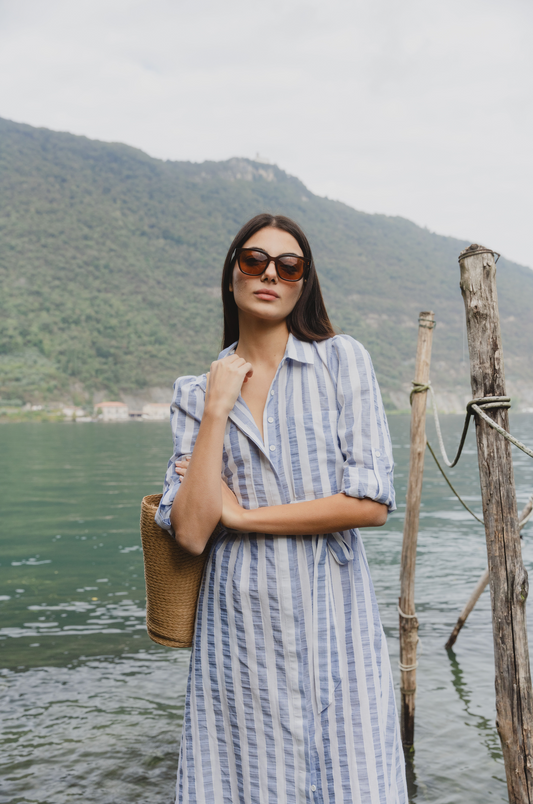 AMONG THE BRAVE CYPRUS BLUE STRIPE LS SHIRT MIDI DRESS
